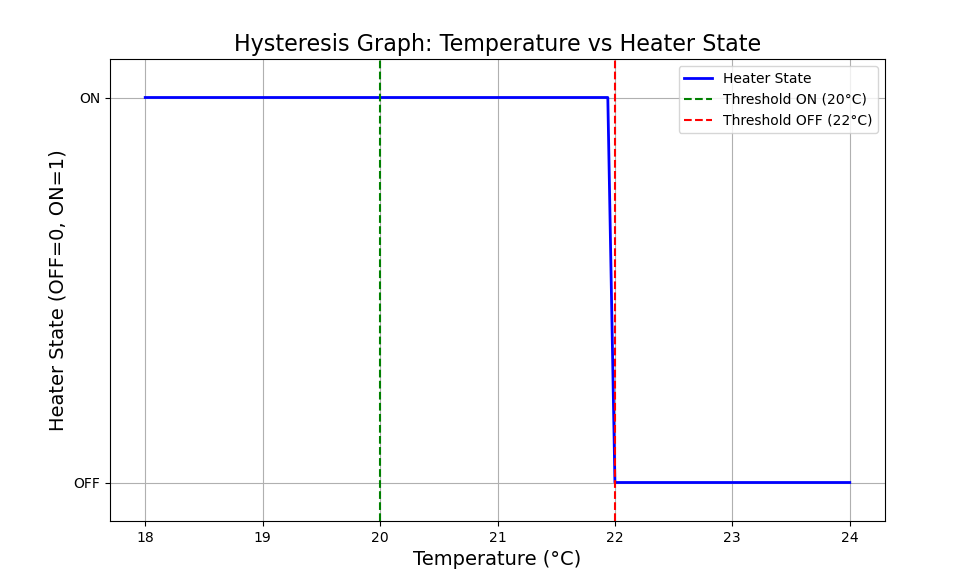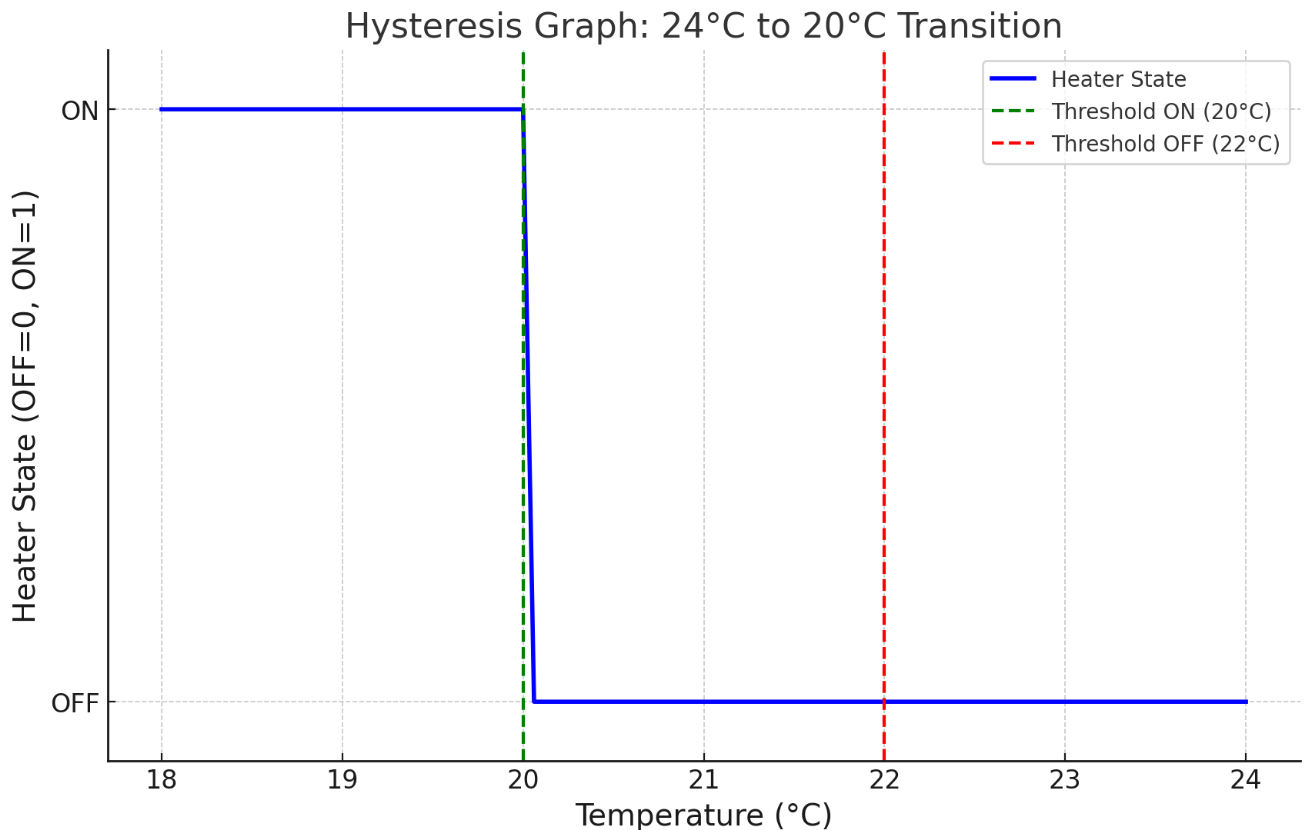 히스테리시스는 이러한 문제를 방지하기 위해 설정된 임계점을 다르게 만들어 특정 범위 내에서 온도를 유지하도록 한다. 예를 들어, 20도 이하로 내려가면 히터가 켜지고, 22도 이상으로 올라가면 히터가 꺼지도록 설정함으로써 시스템이 과도하게 반응하는 것을 막는 것이다.